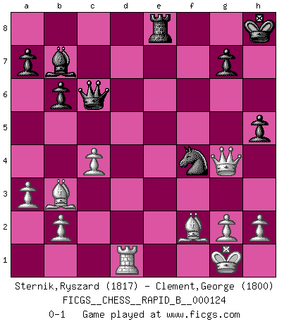 Last move : 0-1 2009 August 15 22:44:37 [Event "FICGS__CHESS__RAPID_B__000124"] [Site "FICGS"] [Date "2009.07.31"] [Round "1"] [White "Sternik,Ryszard"] [Black "Clement,George"] [Result "0-1"] [WhiteElo "1817"] [BlackElo "1800"] 1.e4 e6 2.Qe2 d5 3.exd5 Qxd5 4.Nc3 Qf5 5.d4 Nc6 6.Nb5 Bd6 7.c3 Nf6 8.Qe3 O-O 9.Nxd6 cxd6 10.Bd3 Qa5 11.Nf3 e5 12.dxe5 dxe5 13.Ng5 Ne7 14.Qf3 h6 15.Ne4 Nxe4 16.Bxe4 f5 17.Bc2 e4 18.Bb3+ Kh7 19.Qe2 b6 20.Bd2 Ba6 21.c4 Qc5 22.O-O Rad8 23.Rfd1 Ng6 24.a3 Rfe8 25.Be3 Qc8 26.f4 exf3 27.Qxf3 Bb7 28.Qh3 Rxd1+ 29.Rxd1 Qc6 30.Bf2 Nf4 31.Qxf5+ Kh8 32.Qg4 h5 0-1 French : Chigorin variation Kingside Castling by player Black (move 8) Kingside Castling by player White (move 22) Player Black won this chess game. Follow this game move after move (download)Bobby Fischer is the greatest Chess player who has ever lived. (Ken Smith) Das Schachspiel hat wie die Liebe, die Musik, die Fähigkeit, den Menschen glücklich zu machen. Ich habe ein leises Gefühl des Bedauerns für jeden, der das Schachspiel nicht kennt, so wie ich jeden bedaure, der die Liebe nicht kennt. (Siegbert Tarrasch) Si un gobernante no entiende al Ajedrez, ¿como puede governar él un reinado?. (El Rey Khusros II) Lorsque vous vous retrouvez devant une position atroce, ne tendez pas un ultime piège dérisoire avec l'intention d'abandonner si l'adversaire le déjoue ! Faites-vous plutôt un devoir de résister comme si votre vie en dépendait. Jouez le coup qui vous déplairait au centuple si vous étiez dans la peau de votre tortionnaire ! Go and wake up your luck. (Persian saying)