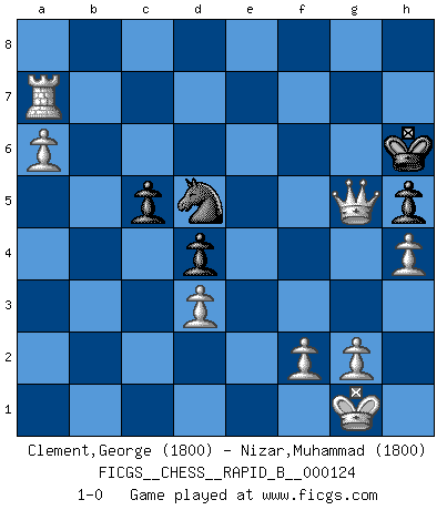 Last move : 1-0 2009 October 29 18:13:14 [Event "FICGS__CHESS__RAPID_B__000124"] [Site "FICGS"] [Date "2009.07.31"] [Round "1"] [White "Clement,George"] [Black "Nizar,Muhammad"] [Result "1-0"] [WhiteElo "1800"] [BlackElo "1800"] 1.e4 c5 2.Nf3 Nc6 3.Nc3 e5 4.Bc4 Be7 5.d3 Nf6 6.h3 O-O 7.O-O d6 8.Nd5 Nxd5 9.Bxd5 Be6 10.c3 Bf6 11.Bxe6 fxe6 12.a3 d5 13.b4 Qd6 14.Qb3 b6 15.Be3 h6 16.Rab1 Rab8 17.Qa4 Kh8 18.Rfd1 Rfd8 19.bxc5 bxc5 20.Rxb8 Rxb8 21.Nd2 Rc8 22.Rb1 Qe7 23.Nf3 d4 24.cxd4 exd4 25.Bf4 e5 26.Bg3 Nd8 27.Qc4 Kh7 28.a4 Nf7 29.Qd5 Rc7 30.Rc1 h5 31.h4 g6 32.a5 Kg7 33.a6 Kh7 34.Rb1 Rd7 35.Qc4 Rc7 36.Rb8 Rd7 37.Qb5 Nd8 38.Nxe5 Bxe5 39.Bxe5 Kh6 40.Bf6 Qd6 41.e5 Qc7 42.Bg5+ Kh7 43.e6 Re7 44.Bxe7 Qxe7 45.Qd7 Qxd7 46.exd7 Nc6 47.Rc8 Ne7 48.Rc7 Nd5 49.Rxa7 Kh6 50.d8Q g5 51.Qxg5+ 1-0 Sicilian defense Kingside Castling by player Black (move 6) Kingside Castling by player White (move 7) Promotion Queen by player White (move 50) Player White won this chess game. Follow this game move after move (download)It's always better to sacrifice your opponent's men. (Savielly Tartakover) Wenn Capablanka heute auf der Schachbühne erscheinen würde, hätte er ein halbes Jahr gebraucht um sich die Schachtheorie anzueignen. Und dann hätte er alles und jeden besiegt. (Mikhail Moiseyevich Botvinik) En el Ajedrez, cuando menos, el valiente hereda la tierra. (Edmar Mednis) Un footballeur joue avec ses pieds, parfois avec sa tête. Un joueur d'échecs ne joue qu'avec sa tête. Et quand il ne joue plus, il meurt. (Jacob Murray) Kids, you tried your best and you failed miserably. The lesson is, never try. (Simpsons)