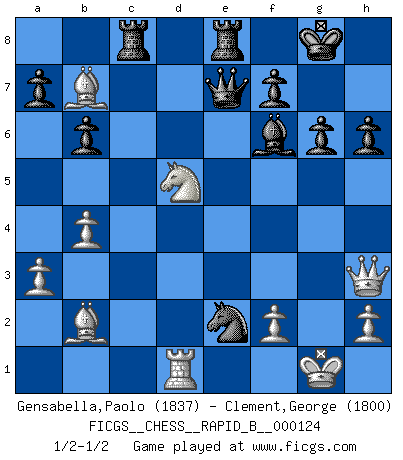 Last move : 1/2-1/2 2009 August 20 18:2:6 [Event "FICGS__CHESS__RAPID_B__000124"] [Site "FICGS"] [Date "2009.07.31"] [Round "1"] [White "Gensabella,Paolo"] [Black "Clement,George"] [Result "1/2-1/2"] [WhiteElo "1837"] [BlackElo "1800"] 1.d4 e6 2.c4 Nf6 3.Nf3 b6 4.g3 Bb7 5.Bg2 c5 6.O-O cxd4 7.Qxd4 Nc6 8.Qh4 h6 9.Nc3 Bb4 10.Na4 O-O 11.Rd1 Ne7 12.a3 Ng6 13.Qd4 Be7 14.b3 d5 15.Bb2 Rc8 16.Ne5 Nxe5 17.Qxe5 Re8 18.Nc3 Nd7 19.Qh5 Bf6 20.Rac1 Nc5 21.cxd5 exd5 22.b4 g6 23.Qh3 Nb3 24.Bxd5 Nxc1 25.Bxb7 Nxe2+ 26.Kf1 Qe7 27.Nd5 Nxg3+ 28.Kg1 Ne2+ 1/2-1/2 Queen's pawn Kingside Castling by player White (move 6) Kingside Castling by player Black (move 10) This chess game ended in a draw. Follow this game move after move (download)Spassky will not be psyched out by Fischer. (Mike Goodall) Ich war schon mal beim Dopingtest. Da musste ich Urin abgeben, während Dritte zusahen. (Elisabeth Pähtz) El juego de Fischer siempre fue nítido, racional y brillante. Uno de los mejores por siempre. (Dave Regis) Les échecs, c'est l'imagination. (David Bronstein) Don't be irreplaceable, if you can't be replaced, you can't be promoted. (Dan Rotaru)