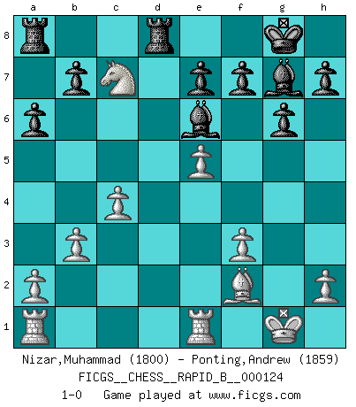 Last move : 1-0 2009 November 1 17:49:12 [Event "FICGS__CHESS__RAPID_B__000124"] [Site "FICGS"] [Date "2009.07.31"] [Round "1"] [White "Nizar,Muhammad"] [Black "Ponting,Andrew"] [Result "1-0"] [WhiteElo "1800"] [BlackElo "1859"] 1.d4 Nf6 2.c4 g6 3.Nc3 Bg7 4.e4 O-O 5.e5 Ne8 6.f4 d6 7.Nf3 dxe5 8.Nxe5 Nd6 9.Bd3 Nc6 10.Be3 Nf5 11.Bxf5 Bxf5 12.O-O Nxe5 13.fxe5 c5 14.Re1 cxd4 15.Bxd4 Qd7 16.Bf2 Rfd8 17.Qf3 Be6 18.b3 Qc6 19.Nb5 Qxf3 20.gxf3 a6 21.Nc7 1-0 King's Indian : 4.e4 Kingside Castling by player Black (move 4) Kingside Castling by player White (move 12) Player White won this chess game. Follow this game move after move (download)Combinations have always been the most intriguing aspect of Chess. The masters look for them, the public applauds them, the critics praise them. It is because combinations are possible that Chess is more than a lifeless mathematical exercise. They are the poetry of the game; they are to Chess what melody is to music. They represent the triumph of mind over matter. (Reuben Fine) Oft bringt ein stiller Zug das Erdbeben. (Richard Reti) El Ajedrez por encima de todo... ¡es una pelea!. (Emanuel Lasker) Les Echecs ne sont pas pour les âmes timides. Ils requièrent un homme entier, qui ne s'arrête pas aveuglément à ce qui a été déjà établi, mais qui tente individuellement de sonder les profondeurs du jeu. (W. Steinitz) I believe in luck. How else can you explain the success of those you dislike ? (Jean Cocteau)