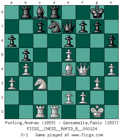 Last move : 0-1 2009 October 25 7:28:51 [Event "FICGS__CHESS__RAPID_B__000124"] [Site "FICGS"] [Date "2009.07.31"] [Round "1"] [White "Ponting,Andrew"] [Black "Gensabella,Paolo"] [Result "0-1"] [WhiteElo "1859"] [BlackElo "1837"] 1.d4 Nf6 2.c4 e6 3.Nf3 d5 4.g3 dxc4 5.Bg2 Nc6 6.Qa4 Bb4+ 7.Bd2 Nd5 8.Bxb4 Ndxb4 9.O-O O-O 10.a3 Nd5 11.Qxc4 Bd7 12.Nc3 Nb6 13.Qd3 Re8 14.b4 Rb8 15.Rfd1 a6 16.Ne5 Nxe5 17.dxe5 Qe7 18.Be4 h6 19.Qf3 Bc8 20.h4 Nd7 21.Qf4 b5 22.Rac1 Rd8 0-1 This chess game has been lost on time (started : 2009.07.31 16:15:20) Queen's pawn game Kingside Castling by player White (move 9) Kingside Castling by player Black (move 9) Player Black won this chess game. Follow this game move after move (download)By playing at Chess then, we may learn: First: Foresight... Second: Circumspection... Third: Caution... And lastly, we learn by Chess the habit of not being discouraged by present bad appearances in the state of our affairs, the habit of hoping for a favorable chance, and that of persevering in the secrets of resources. (Benjamin Franklin) Der zweitbeste Zug ist oft der einzig richtige. (Savielly Grigorievitsch Tartakower) El Ajedrez es un expediente tonto que hace creer a la gente inactiva que hacen una cosa muy astuta cuando solamente estan perdiendo su tiempo. (George Bernard Shaw) Fischer est le meilleur joueur du monde et Karpov n'est qu'un joueur de bistrot. (Garry Kasparov, agé de 16 ans) Knowledge rests not upon truth alone, but upon error also. (Carl G. Jung)