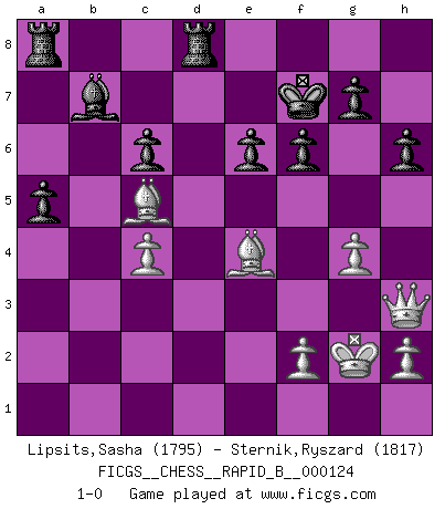 Last move : 1-0 2009 September 15 10:46:49 [Event "FICGS__CHESS__RAPID_B__000124"] [Site "FICGS"] [Date "2009.07.31"] [Round "1"] [White "Lipsits,Sasha"] [Black "Sternik,Ryszard"] [Result "1-0"] [WhiteElo "1795"] [BlackElo "1817"] 1.e4 c5 2.Nf3 Nc6 3.d4 cxd4 4.Nxd4 Nf6 5.Nc3 d6 6.Bg5 e6 7.Qd2 a6 8.O-O-O h6 9.Nxc6 bxc6 10.Bf4 d5 11.Qe3 Qa5 12.Be2 dxe4 13.Qg3 Nd5 14.Nxe4 Qxa2 15.Nd6+ Bxd6 16.Bxd6 Qa1+ 17.Kd2 Qxb2 18.Be5 Qb4+ 19.c3 Qb2+ 20.Ke1 Rg8 21.c4 Qb4+ 22.Kf1 Ne7 23.Bd6 Qb7 24.Qd3 Nf5 25.Bc5 Bd7 26.g4 Ne7 27.Qd6 Nc8 28.Qg3 Qb8 29.Qe3 Ne7 30.Kg2 Qc7 31.Rd6 f6 32.Rhd1 Bc8 33.Qh3 Rh8 34.Rd8+ Qxd8 35.Rxd8+ Kxd8 36.Qa3 Ke8 37.Bxe7 Kf7 38.Bc5 Rd8 39.Bf3 Bb7 40.Be4 a5 41.Qh3 1-0 Sicilian defense Queenside Castling by player White (move 8) Player White won this chess game. Follow this game move after move (download)Chess is the art which expresses the science of logic. (Mikhail Botvinnik) Ich rechne überhaupt nicht voraus. Ich gewinne auch so. (Robert James Fischer) Repentinamente, me resultaba obvio en mi analisis que yo había pasado por alto lo que Fischer había visto en el tablero con la mas grande facilidad. (Mikhail Botvinnik) Aidez vos pièces, elles vous aideront. (Paul Morphy) You must have a dream in order to have it come true. (A.P.J. Kalam)