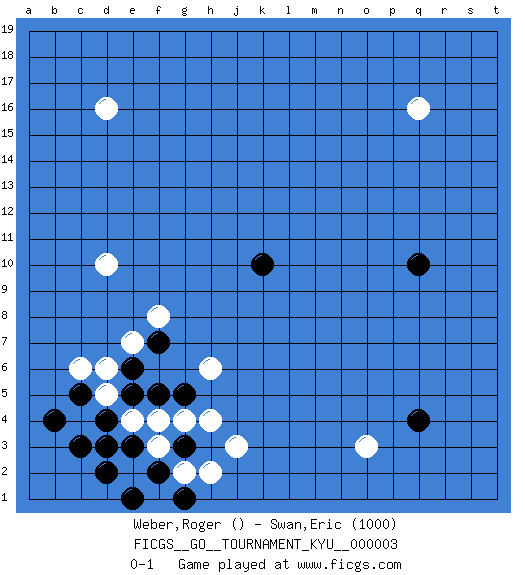 Last move : 0-1 2006 November 24 21:11:59 [Event "FICGS__GO__TOURNAMENT_KYU__000003"] [Site "FICGS"] [Date "2006.09.21"] [Round "1"] [Black "Weber,Roger"] [White "Swan,Eric"] [Result "0-1"] [Rating 2 "1000"] 1.d4 q16 2.q4 d16 3.k10 f3 4.e3 f4 5.f2 d5 6.d2 j3 7.e1 d10 8.q10 o3 9.g5 e4 10.e5 c4 11.d3 g2 12.g1 h2 13.g3 g4 14.f5 h4 15.c5 d6 16.b4 c6 17.c3 h6 18.e6 e7 19.f7 f8 0-1 This go game has been lost on time (started : 2006.09.21 4:4:5) Here are the names of the openings (joseki) played in the four corners : Corner d4 : d4 f3 Hoshi (Hwajeom, Seongjeom, Xingwei`) 4-4 Point. The star or hoshi (4-4) point, emphasizing influence at the potential expense of territory. Ikken Kakari (Hankan Keolch'im, Yi Gua`jiao~, 1-Space Low Approach). White 2 is the standard approach move to the 4-4. Corner q4 : q4 o3 Hoshi (Hwajeom, Seongjeom, Xingwei`) 4-4 Point. The star or hoshi (4-4) point, emphasizing influence at the potential expense of territory. Ikken Kakari (Hankan Keolch'im, Yi Gua`jiao~, 1-Space Low Approach). White 2 is the standard approach move to the 4-4. Player White won this Go (weiqi, baduk) game. Follow this game move after move (download)Go is essentially a form of harmony. Go in the 21st century will have to be go of the 'harmony of the six points - the four quarters, the above and the below.' As in life we will need to view the whole rather than the part. Japanese go has focused too heavily on the local (joseki) rather than the whole for 300 years. The reason the Chinese and Koreans are overtaking the Japanese is that they are closer to achieve this whole-board view. (Go Seigen, 9p, 1994) Luck is the residue of design. (John Milton)