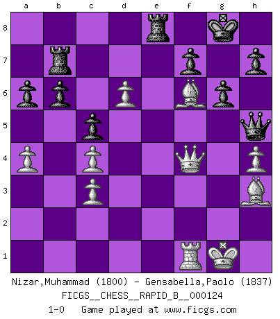 Last move : 1-0 2009 November 5 21:57:41 [Event "FICGS__CHESS__RAPID_B__000124"] [Site "FICGS"] [Date "2009.07.31"] [Round "1"] [White "Nizar,Muhammad"] [Black "Gensabella,Paolo"] [Result "1-0"] [WhiteElo "1800"] [BlackElo "1837"] 1.d4 Nf6 2.c4 g6 3.Nc3 d6 4.e4 Bg7 5.Be2 O-O 6.Nf3 c5 7.d5 e6 8.O-O exd5 9.exd5 Re8 10.Bf4 Nh5 11.Be3 Nd7 12.Qd2 Ne5 13.h3 Nxf3+ 14.Bxf3 Nf6 15.Bf4 Bf5 16.Bg5 a6 17.a4 Qc7 18.Rfe1 Nd7 19.g4 Ne5 20.Rxe5 Rxe5 21.gxf5 Rxf5 22.Bg2 Bxc3 23.bxc3 Re5 24.f4 R5e8 25.Bf6 Qd7 26.f5 Qxf5 27.Rf1 Qh5 28.Qf4 b6 29.Qxd6 Rab8 30.Qf4 Rb7 31.h4 Rd7 32.Bh3 Rb7 33.d6 1-0 King's Indian defense, 3.Nc3 Kingside Castling by player Black (move 5) Kingside Castling by player White (move 8) Player White won this chess game. Follow this game move after move (download)That's what Chess is all about. One day you give your opponent a lesson, the next day he gives you one. (Bobby Fischer) Schach ist Krieg, im Schach geht es um testosterongesteuerte Urschreie. (Garry Kasparov) En el Ajedrez, cuando menos, el valiente hereda la tierra. (Edmar Mednis) RxDa4 pat (...) Tree pose grows confidence. It roots me to this world. (Terri Guillemets)