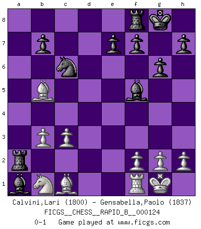 Last move : 0-1 2009 September 24 21:52:36 [Event "FICGS__CHESS__RAPID_B__000124"] [Site "FICGS"] [Date "2009.07.31"] [Round "1"] [White "Calvini,Lari"] [Black "Gensabella,Paolo"] [Result "0-1"] [WhiteElo "1800"] [BlackElo "1837"] 1.Nf3 d5 2.e3 Nf6 3.Be2 g6 4.Nd4 Bg7 5.O-O O-O 6.b3 c5 7.Nb5 Nc6 8.d4 Ne4 9.Bd3 a6 10.Bxe4 axb5 11.Bd3 cxd4 12.e4 dxe4 13.Bxe4 d3 14.Qxd3 Qxd3 15.Bxd3 Bxa1 16.Bxb5 Rxa2 17.c3 Bf5 0-1 This chess game has been lost on time (started : 2009.07.31 16:15:20) Reti Opening Kingside Castling by player White (move 5) Kingside Castling by player Black (move 5) Player Black won this chess game. Follow this game move after move (download)The beauty of a move lies not in its' appearance but in the thought behind it. (Siegbert Tarrasch) Wenn ich mich einlogge, glauben die Leute gewöhnlich nicht, dass ich es selbst bin und sie fangen an, mir dumme Fragen zu stellen. Und wenn sie es glauben, stellen sie wieder andere dumme Fragen. (Judith Polgar) Fischer deseaba darle a los Rusos una sopa de su propia medicina. (Larry Evans) Donnez-moi un Cavalier en 6e et je gagnerais toutes mes parties. (Steinitz) There is a very easy way to return from a casino with a small fortune : go there with a large one. (Jack Yelton)