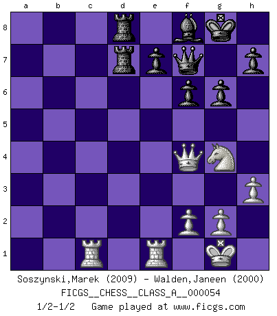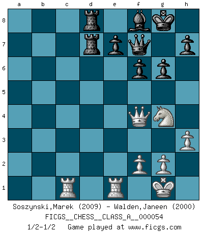 Last move : 1/2-1/2 2009 November 7 18:50:25 [Event "FICGS__CHESS__CLASS_A__000054"] [Site "FICGS"] [Date "2009.07.31"] [Round "1"] [White "Soszynski,Marek"] [Black "Walden,Janeen"] [Result "1/2-1/2"] [WhiteElo "2009"] [BlackElo "2000"] 1.e4 c5 2.Nf3 Nc6 3.Bb5 g6 4.O-O Bg7 5.c3 Nf6 6.e5 Nd5 7.d4 cxd4 8.cxd4 O-O 9.Re1 d6 10.Nc3 Be6 11.Bg5 dxe5 12.Bxc6 bxc6 13.Nxe5 Rc8 14.Rc1 Nxc3 15.bxc3 c5 16.Qa4 Re8 17.Be3 Qd6 18.Nf3 cxd4 19.Bxd4 Qd7 20.Qa5 Qc7 21.Qa3 Bf8 22.h3 Red8 23.c4 Bxc4 24.Bxa7 Ra8 25.Ne5 Rxa7 26.Qf3 Qa5 27.Nxc4 Qxa2 28.Ne5 Ra3 29.Qf4 f6 30.Ng4 Rad3 31.Ne3 Qf7 32.Ng4 Qb3 33.Qc7 R3d7 34.Qf4 Qf7 1/2-1/2 Sicilian : Nimzovich-Rossolimo attack (with ...g6, without ...d6) Kingside Castling by player White (move 4) Kingside Castling by player Black (move 8) This chess game ended in a draw. Follow this game move after move (download)Later, I began to succeed in decisive games. Perhaps because I realized a very simple truth: not only was I worried, but also my opponent. (Mikhail Tal) Über die Verhaftung Bobby Fischers: Warum es die Bush-Administration für nötig befindet einen 61 Jahre alten Mann zu hetzten, der für niemanden ausser sich selbste eine Gefahr darstellt ist ein Rätsel. (Nigel Short) La esencia del Ajedrez es pensar acerca de lo que el Ajedrez es. (David Bronstein) Même si l'adversaire joue le coup analysé précédemment, recommencez l'analyse en voyant la nouvelle position. Première règle de Blumenfeld All maxims have their antagonist maxims; proverbs should be sold in pairs, a single one being but a half truth. (William Mathews)
