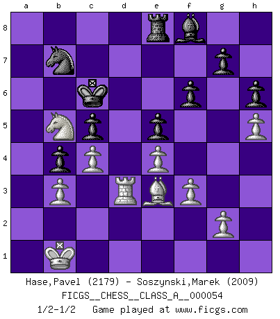 Last move : 1/2-1/2 2009 September 14 0:55:25 [Event "FICGS__CHESS__CLASS_A__000054"] [Site "FICGS"] [Date "2009.07.31"] [Round "1"] [White "Hase,Pavel"] [Black "Soszynski,Marek"] [Result "1/2-1/2"] [WhiteElo "2179"] [BlackElo "2009"] 1.e4 e5 2.Nf3 Nc6 3.Bb5 Nf6 4.Nc3 Bd6 5.O-O O-O 6.d3 h6 7.a4 Nb4 8.Bc4 c6 9.Na2 Re8 10.Re1 Nxa2 11.Bxa2 Bc7 12.d4 d6 13.dxe5 dxe5 14.Qxd8 Rxd8 15.h3 Ba5 16.c3 Bc7 17.a5 Bd7 18.Be3 b6 19.axb6 axb6 20.Nd2 Kf8 21.Bb3 Nh5 22.Nc4 c5 23.Red1 Ke7 24.Na3 Nf4 25.f3 Be6 26.Bxe6 Nxe6 27.Kf2 Rxd1 28.Rxd1 Nd8 29.Ke2 Nb7 30.Nb5 Bb8 31.Kd3 Kd7 32.Na3 Kc6 33.Kc2 b5 34.c4 b4 35.Nb5 Ra4 36.h4 f6 37.h5 Bd6 38.Kb1 Bf8 39.b3 Ra8 40.Rd5 Re8 41.Rd2 Ra8 42.Rd3 Re8 1/2-1/2 Ruy Lopez : Berlin defense Kingside Castling by player White (move 5) Kingside Castling by player Black (move 5) This chess game ended in a draw. Follow this game move after move (download)When in doubt... play Chess ! (Tevis) Zum Sieg gelangt man nicht, wenn man gut, sondern nur wenn man besser spielt (Savielly Grigorievitsch Tartakower) Un jugador que trata de regresar una movida en el Ajedrez es un futuro carterista. (Richard Fenton) On croit qu'il y a plus de mauvais joueurs que de bons joueurs, c'est faux : Il y a autant de joueurs qui gagnent que de joueurs qui perdent. (Philippe Geluck) All war is based on deception. (Sun Tzu)