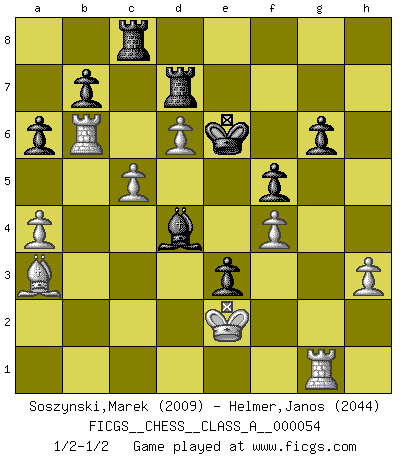 Last move : 1/2-1/2 2009 September 23 19:13:27 [Event "FICGS__CHESS__CLASS_A__000054"] [Site "FICGS"] [Date "2009.07.31"] [Round "1"] [White "Soszynski,Marek"] [Black "Helmer,Janos"] [Result "1/2-1/2"] [WhiteElo "2009"] [BlackElo "2044"] 1.e4 c5 2.Nf3 Nc6 3.Bb5 g6 4.O-O Bg7 5.c3 Nf6 6.Re1 O-O 7.e5 Nd5 8.d4 cxd4 9.cxd4 d6 10.Nc3 Nxc3 11.bxc3 Bg4 12.exd6 Qxd6 13.h3 Be6 14.a4 Qc7 15.Ba3 Bd5 16.Rc1 Rfd8 17.Ng5 e5 18.c4 Bxg2 19.d5 h6 20.Kxg2 hxg5 21.d6 Qd7 22.Qg4 f5 23.Qxg5 a6 24.Bxc6 Qxc6+ 25.Kh2 Qf3 26.Qg3 Qxg3+ 27.Kxg3 Rac8 28.c5 Rd7 29.Rb1 e4 30.f3 e3 31.f4 Bd4 32.Kf3 Kf7 33.Ke2 Ke6 34.Rg1 Rg7 35.Rb6 Rd7 1/2-1/2 Sicilian : Nimzovich-Rossolimo attack (with ...g6, without ...d6) Kingside Castling by player White (move 4) Kingside Castling by player Black (move 6) This chess game ended in a draw. Follow this game move after move (download)I thought the most common mistake [in chess] was the first one: Learning the game :P (Garvin Gray, FICGS forum) Nach Morphy wurde nichts neues mehr in der Behandlung offener Positionen gefunden. (Mikhail Moiseyevich Botvinik) Debes de llevar a tu oponente hacia un profundo y obscuro bosque donde 2+2=5, y el camino que conduce a la salida es suficientemente ancho para solamente uno. (Mikhail Tal) A chaque perte on perd un peu de soi. (Joël Lautier) A computer lets you make more mistakes faster than any invention in human history - with the possible exceptions of handguns and tequila. (Mitch Ratcliffe)