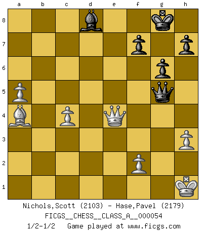 Last move : 1/2-1/2 2009 August 27 23:56:43 [Event "FICGS__CHESS__CLASS_A__000054"] [Site "FICGS"] [Date "2009.07.31"] [Round "1"] [White "Nichols,Scott"] [Black "Hase,Pavel"] [Result "1/2-1/2"] [WhiteElo "2103"] [BlackElo "2179"] 1.e4 c5 2.Nf3 d6 3.d4 cxd4 4.Nxd4 Nf6 5.Nc3 a6 6.Be3 e5 7.Nb3 Be6 8.Qf3 Nbd7 9.h3 Rc8 10.Be2 Be7 11.O-O O-O 12.Rfd1 b5 13.a3 Qc7 14.Qg3 Rfe8 15.Bd3 Nb6 16.Nd2 d5 17.Bxb6 Qxb6 18.exd5 Nxd5 19.Nxd5 Bxd5 20.a4 bxa4 21.Qxe5 Qc6 22.c4 Bxg2 23.Qg3 Rcd8 24.Bc2 Qh6 25.Qxg2 Rxd2 26.Qe4 Qg5+ 27.Kh1 Rxd1+ 28.Rxd1 g6 29.Bxa4 Rd8 30.Rxd8+ Bxd8 31.b4 a5 32.bxa5 1/2-1/2 Sicilian : Najdorf, Byrne (English) attack Kingside Castling by player White (move 11) Kingside Castling by player Black (move 11) This chess game ended in a draw. Follow this game move after move (download)There just isn't enough televised Chess. (David Letterman) Ein Schachgenie ist jemand der verdammt gut Schach spielt. (Jonathan Levitt) Siempre es mucho mejor sacrificar las piezas de tu oponente. (Savielly Tartakover) C'est une question de caractère, Beaucoup de gens perdent leur motivation très vite. D'autres, ils sont rares, peuvent la conserver très longtemps. J'aime les échecs, encore aujourd'hui je suis heureux d'analyser des parties. J'aime toujours gagner, je déteste encore perdre. Bien jouer est important pour mon intégrité intellectuelle et morale. Et puis les échecs vivent en ce moment une période historique grâce à Internet. Ils se développent dans les systèmes éducatifs à travers le monde. Ils sortent de leur ghetto, et c'est mon rôle de mener à bien cette révolution. (Gary Kasparov) It's unlucky to be superstitious. (Dave Enteles)