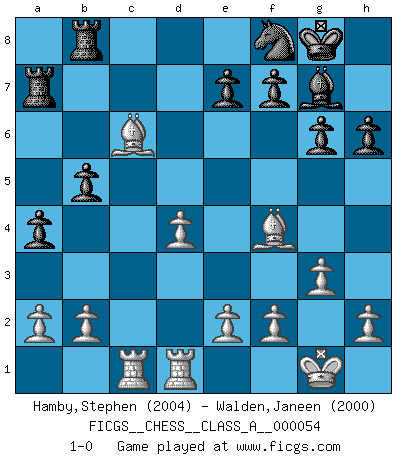 Last move : 1-0 2009 December 27 13:50:52 [Event "FICGS__CHESS__CLASS_A__000054"] [Site "FICGS"] [Date "2009.07.31"] [Round "1"] [White "Hamby,Stephen"] [Black "Walden,Janeen"] [Result "1-0"] [WhiteElo "2004"] [BlackElo "2000"] 1.Nf3 d5 2.c4 c6 3.g3 Nf6 4.Bg2 g6 5.d4 Bg7 6.O-O O-O 7.Qb3 a5 8.Rd1 a4 9.Qb4 dxc4 10.Qxc4 Qa5 11.Bd2 Qa6 12.Na3 Be6 13.Qxa6 Nxa6 14.Ng5 Bd7 15.Nc4 h6 16.Nf3 b5 17.Nb6 Ra7 18.Ne5 Nb8 19.Nbxd7 Nfxd7 20.Nxc6 Nxc6 21.Bxc6 Rb8 22.Rac1 Nf8 23.Bf4 1-0 Reti Opening Kingside Castling by player White (move 6) Kingside Castling by player Black (move 6) Player White won this chess game. Follow this game move after move (download)What is the difference between chess and football? Everybody understands football, but nobody plays it. Everybody plays chess, but nobody understands it. Everything is relative. (Vladimir Kramnik) Man wirke der falschen Auffassung entgegen, als ob jeder Zug Unmittelbares zu leisten habe; auch Werte- und Ruhezüge haben ihre Existenzberechtigung. (Aaron Nimzowitsch) Hay dos clases de hombres: aquellos que se conforman en dejarse llevar por las circunstancias y que juegan barajas y aquellos decididos a controlar las circunstancias y que juegan al Ajedrez. (Mortimer Collins) On est toujours la mazette de quelqu'un d'autre. (Anonyme) Is not life a hundred times too short to bore ourselves ? (Friedrich Nietzsche)