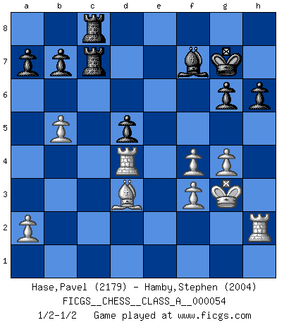 Last move : 1/2-1/2 2010 April 5 23:46:23 [Event "FICGS__CHESS__CLASS_A__000054"] [Site "FICGS"] [Date "2009.07.31"] [Round "1"] [White "Hase,Pavel"] [Black "Hamby,Stephen"] [Result "1/2-1/2"] [WhiteElo "2179"] [BlackElo "2004"] 1.e4 e6 2.d4 d5 3.Nd2 Nf6 4.e5 Nfd7 5.Bd3 c5 6.c3 Nc6 7.Ne2 cxd4 8.cxd4 f6 9.exf6 Nxf6 10.O-O Bd6 11.Nf3 Qc7 12.Bg5 O-O 13.Bh4 Qb6 14.Qd2 Bd7 15.Bg3 Bxg3 16.hxg3 Rae8 17.Rae1 Kh8 18.b3 Ng4 19.Bc2 e5 20.dxe5 Ngxe5 21.Ned4 Qb4 22.Qxb4 Nxf3+ 23.gxf3 Nxb4 24.Kg2 g6 25.Bb1 Kg7 26.Re3 Nc6 27.Rd1 Nxd4 28.Rxd4 Be6 29.b4 Kf6 30.Bc2 Rf7 31.g4 Rfe7 32.Bb3 Bg8 33.Red3 Rd8 34.f4 Rd6 35.Re3 Red7 36.Kg3 h6 37.Re1 Bf7 38.f3 Rc7 39.Re3 Rd8 40.Re2 Rd6 41.Rh2 Kg7 42.Rhd2 Kf6 43.Bc4 Rd8 44.Bd3 Rdc8 45.Rh2 Kg7 46.b5 1/2-1/2 French : Tarrasch, Closed variation Kingside Castling by player White (move 10) Kingside Castling by player Black (move 12) This chess game ended in a draw. Follow this game move after move (download)Many Chess players were surprised when after the game, Fischer quietly explained: 'I had already analyzed this possibility' in a position which I thought was not possible to foresee from the opening. (Mikhail Tal) Intelligenz läßt sich nicht am Weg, sondern nur am Ergebnis feststellen. (Garry Kasparov) Si tu oponente no puede hacer nada activo, entonces no apures la posición; En vez de eso, dejalo estar sentado ahí, sufriendo y rogandote por un empate. (Jeremy Silman) Les pièces de l'échiquier étaient impitoyables. Elles le retenaient, elles l'absorbaient. Il y avait de l'horreur en cela, mais aussi une harmonie unique. Car, qu'y a-t-il dans le monde, à part les échecs ? (V. Nabokov) Perhaps chess is the wrong game for the times (The Chess Master and the Computer, by Garry Kasparov - 2010)