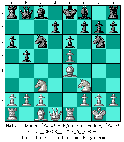 Last move : 1-0 2009 November 15 8:53:32 [Event "FICGS__CHESS__CLASS_A__000054"] [Site "FICGS"] [Date "2009.07.31"] [Round "1"] [White "Walden,Janeen"] [Black "Agrafenin,Andrey"] [Result "1-0"] [WhiteElo "2000"] [BlackElo "2057"] 1.e4 c5 2.Nf3 e6 3.d4 cxd4 4.Nxd4 a6 5.Nc3 b5 6.Bd3 Qb6 7.Nf3 Nc6 8.O-O Qb8 9.e5 Nge7 10.Re1 Ng6 11.Be4 1-0 This chess game has been lost on time (started : 2009.07.31 16:24:7) Sicilian : Kan, 5.Nc3 Kingside Castling by player White (move 8) Player White won this chess game. Follow this game move after move (download)Chess, like any creative activity, can exist only through the combined efforts of those who have creative talent, and those who have the ability to organize their creative work. (Mikhail Botvinnik) Kein Schachspieler kann gut schlafen. (H. G. Wells) No hay precio que no valga la pena por la cabellera del Rey enemigo. (Koblentz) Toutes les manuvres exécutées sur une colonne ouverte ont pour but ultime l'intrusion définitive sur la septième ou la huitième rangée, en plein cur de la position ennemie. (Aaron Nimzovitch) At work, the authority of a person is inversely proportional to the number of pens that person is carrying. (Dan Rotaru)