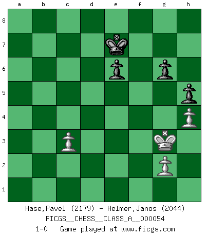 Last move : 1-0 2010 March 2 21:4:43 [Event "FICGS__CHESS__CLASS_A__000054"] [Site "FICGS"] [Date "2009.07.31"] [Round "1"] [White "Hase,Pavel"] [Black "Helmer,Janos"] [Result "1-0"] [WhiteElo "2179"] [BlackElo "2044"] 1.e4 e5 2.Nf3 Nc6 3.Bb5 a6 4.Ba4 Nf6 5.O-O b5 6.Bb3 Bb7 7.d3 Bc5 8.a4 b4 9.Nbd2 O-O 10.Nc4 Re8 11.Be3 Bf8 12.Bg5 h6 13.Bh4 a5 14.Ne3 d6 15.c3 Rb8 16.Bc4 Be7 17.Bg3 Bc8 18.Nh4 Bf8 19.Rc1 bxc3 20.bxc3 Be6 21.Bb5 Bd7 22.Rb1 g6 23.Bc4 Be6 24.Bxe6 Rxe6 25.Qc2 Re8 26.Rb5 Nd7 27.Qa2 Re6 28.Nf3 Nc5 29.Nd2 h5 30.Nf3 Bh6 31.Qc4 Ra8 32.Nd5 Bg7 33.Bh4 Qd7 34.Ng5 R6e8 35.f4 exf4 36.Nxf4 Ne5 37.Qa2 Bh6 38.Nd5 Bxg5 39.Bxg5 Re6 40.Nf6+ Rxf6 41.Bxf6 Nexd3 42.Qd2 Kh7 43.Rf3 Qe6 44.Bd4 c6 45.Rb1 Ne5 46.Bxe5 dxe5 47.Rbf1 Rf8 48.Qf2 Nxa4 49.Qa7 Kg8 50.Qxa5 Qc4 51.Qxe5 Nc5 52.Rd1 Qe2 53.Rd6 Qe1+ 54.Rf1 Qe3+ 55.Kh1 Qe2 56.Qf4 Qxe4 57.Qxe4 Nxe4 58.Rxc6 Ng5 59.h4 Ne6 60.Rxe6 fxe6 61.Rxf8+ Kxf8 62.Kh2 Ke7 63.Kg3 1-0 Ruy Lopez : Archangelsk (counterthrust) variation Kingside Castling by player White (move 5) Kingside Castling by player Black (move 9) 10 pieces endgame at move 60 : White KRPPP , Black KRPPP WHITE : King + 1 Rook 3 Pawns BLACK : King + 1 Rook 3 Pawns 9 pieces endgame at move 61 : White KRPPP , Black KPPP WHITE : King + 1 Rook 3 Pawns BLACK : King + 3 Pawns 8 pieces endgame at move 61 : White KPPP , Black KPPP WHITE : King + 3 Pawns BLACK : King + 3 Pawns Player White won this chess game. Follow this game move after move (download)You must take your opponent into a deep dark forest where 2+2=5, and the path leading out is only wide enough for one. (Mikhail Tal) Schach ist das schnellste Spiel der Welt, weil man in jeder Sekunde Tausende von Gedanken ordnen muß. (Albert Einstein) Un jugador que trata de regresar una movida en el Ajedrez es un futuro carterista. (Richard Fenton) La vie et les Echecs sont tous les deux une lutte constante. (Lasker) Everybody lies. (Gregory House, House M.D.)