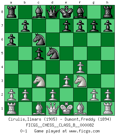 Last move : 0-1 2009 September 19 10:32:48 [Event "FICGS__CHESS__CLASS_B__000082"] [Site "FICGS"] [Date "2009.08.01"] [Round "1"] [White "Cirulis,Ilmars"] [Black "Dumont,Freddy"] [Result "0-1"] [WhiteElo "1905"] [BlackElo "1894"] 1.f4 d5 2.Nf3 Nf6 3.e3 a6 4.c4 c5 5.cxd5 Nxd5 6.Nc3 Nc6 0-1 This chess game has been lost on time (started : 2009.08.01 20:2:25) Bird's Opening Player Black won this chess game. Follow this game move after move (download)The chessboard is the world, the pieces are the phenomena of the Universe, the rules of the game are what we call the laws of Nature and the player on the other side is hidden from us. (Thomas Huxley) Es macht mich traurig, wenn ich sehe, dass Golfprofis mehr verdienen als Schachsportler. Obwohl ich davon überzeugt bin, dass wir Schachspieler viel härter trainieren müssen als die Golfer. (Alexandra Kosteniuk) El Ajedrez es un regaderazo frío para la mente. (Sir John Simon) Il vaut mieux sacrifier les pièces de l'adversaire. (Xavier Tartacover) I would love to change the world, but they won't give me the source code. (Unknown)