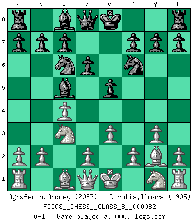 Last move : 0-1 2009 October 18 9:25:34 [Event "FICGS__CHESS__CLASS_B__000082"] [Site "FICGS"] [Date "2009.08.01"] [Round "1"] [White "Agrafenin,Andrey"] [Black "Cirulis,Ilmars"] [Result "0-1"] [WhiteElo "2057"] [BlackElo "1905"] 1.c4 e5 2.Nc3 Nc6 3.g3 Bc5 4.Bg2 d6 5.e3 Nf6 0-1 This chess game has been lost on time (started : 2009.08.01 20:2:25) English : Sicilian Reversed Player Black won this chess game. Follow this game move after move (download)For surely of all the drugs in the world, Chess must be the most permanently pleasurable. (Assiac) Schach sollte überall auf der Welt Schulfach werden. Es fördert die geistige Auseinandersetzung. Es lehrt die Demut in der Niederlage. (Garry Kasparov) Es el objetivo de la escuela moderna no tratar cada posición de acuerdo a una regla general, sino de acuerdo al principio inherente en la posición. (Richard Reti) Je ne suis pas le dernier à jouer lâchement des coups douteux pendant le zeïtnot de l'adversaire pour l'achever: en effet les coups qui font le plus peur sont ceux que l'on ne comprend pas. Je me fais souvent peur quand je joue. (Un professeur anonyme) Every man's memory is his private literature. (Aldous Huxley)