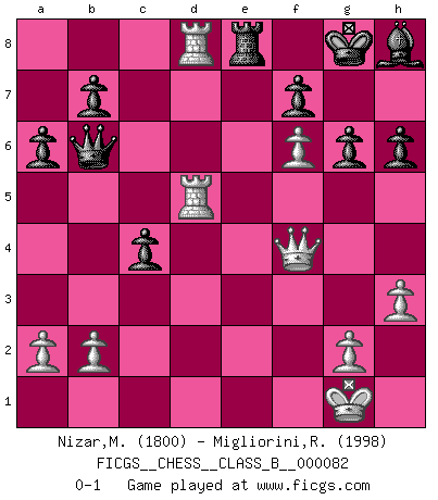 Last move : 0-1 2009 December 30 5:40:21 [Event "FICGS__CHESS__CLASS_B__000082"] [Site "FICGS"] [Date "2009.08.01"] [Round "1"] [White "Nizar,Muhammad"] [Black "Migliorini,Roberto"] [Result "0-1"] [WhiteElo "1800"] [BlackElo "1998"] 1.d4 Nf6 2.c4 g6 3.Nc3 Bg7 4.e4 d6 5.Be2 O-O 6.Nf3 e5 7.dxe5 dxe5 8.O-O Nc6 9.Bg5 Bg4 10.Nd5 Bxf3 11.Bxf3 Nd4 12.Bg4 c6 13.f4 cxd5 14.fxe5 dxc4 15.exf6 Bh8 16.e5 Re8 17.Be3 Nf5 18.Bf4 Nd4 19.Rf2 Ne6 20.Bxe6 Rxe6 21.Qf3 Qb6 22.Rd1 Rae8 23.h3 Qb5 24.Rfd2 a6 25.Rd7 Rxe5 26.Bxe5 Qxe5 27.Rd8 h6 28.R1d5 Qe6 29.Qf4 Qb6+ 0-1 King's Indian : 5.Be2 Kingside Castling by player Black (move 5) Kingside Castling by player White (move 8) Player Black won this chess game. Follow this game move after move (download)I won't play with you anymore. You have insulted my friend. - When an opponent cursed himself for a blunder. (Miguel Najdorf) Mein Gehirn das ist mein zweitwichtigstes Organ [Aus dem Film: Der Schläfer]. (Woody Allen) Las piezas de Ajedrez son los bloques del alfabeto que moldean los pensamientos; y esos pensamientos, aunque hagan un diseño visual en el tablero, expresan abstractamente su belleza como un poema. (Marcel Duchamp) Les échecs sont un jeu terrible. Si vous n'avez pas le centre, votre adversaire a une position plus libre. Par contre, si vous avez le centre, alors vous avez vraiment quelque chose pour laquelle vous inquiéter ! (Siegbert Tarrasch) The age of a woman doesn't mean a thing. The best tunes are played on the oldest fiddles. (Ralph Waldo Emerson)