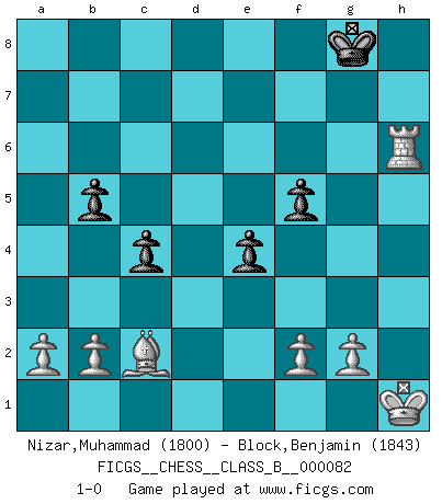 Last move : 1-0 2010 April 16 18:6:19 [Event "FICGS__CHESS__CLASS_B__000082"] [Site "FICGS"] [Date "2009.08.01"] [Round "1"] [White "Nizar,Muhammad"] [Black "Block,Benjamin"] [Result "1-0"] [WhiteElo "1800"] [BlackElo "1843"] 1.d4 Nf6 2.c4 e6 3.Nf3 d5 4.Nc3 c6 5.e3 Nbd7 6.Qc2 Bd6 7.Bd3 O-O 8.O-O dxc4 9.Bxc4 a6 10.Rd1 b5 11.Bd3 Bb7 12.e4 e5 13.dxe5 Nxe4 14.Bxe4 Nxe5 15.Nxe5 Qe7 16.Nf3 g6 17.Bg5 f6 18.Bh6 Rfd8 19.Be3 Kh8 20.Bb6 f5 21.Bxd8 Rxd8 22.Bd3 c5 23.Re1 Qc7 24.Qe2 c4 25.Bc2 Bxf3 26.Qxf3 Bxh2+ 27.Kh1 Be5 28.Rad1 Bd4 29.Re2 Qc8 30.Red2 Bf6 31.Rxd8+ Bxd8 32.Qd5 Bg5 33.Qe5+ Kg8 34.Ne4 fxe4 35.Qxg5 Qf5 36.Rd8+ Kg7 37.Qxf5 gxf5 38.Ra8 h6 39.Rxa6 Kg8 40.Rxh6 1-0 Queen's pawn game Kingside Castling by player Black (move 7) Kingside Castling by player White (move 8) Player White won this chess game. Follow this game move after move (download)The passed pawn is a criminal, who should be kept under lock and key. Mild measures, such as police surveillance, are not sufficient. (Nimzovitch) Offensichtlich kennt Kasparow nichts anderes als Schach, und ich könnte 500 weitere Spieler dieser Sorte benennen. (Judith Polgar) Bobby es la celebridad menos entendida y malinterpretada que camina el la faz de esta tierra. (Yasser Seirawan) Si je n'étais pas joueur d'échecs, je serais le meilleur dans quelque chose d'autre. (Anatoli Karpov) Internet: Absolute communication, absolute isolation. (Paul Carvel)