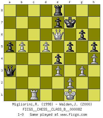 Last move : 1-0 2009 November 23 3:41:21 [Event "FICGS__CHESS__CLASS_B__000082"] [Site "FICGS"] [Date "2009.08.01"] [Round "1"] [White "Migliorini,Roberto"] [Black "Walden,Janeen"] [Result "1-0"] [WhiteElo "1998"] [BlackElo "2000"] 1.c4 c6 2.Nc3 d5 3.cxd5 cxd5 4.d4 Nf6 5.Nf3 g6 6.Bf4 Nc6 7.e3 Bg7 8.h3 O-O 9.Be2 Qb6 10.a3 Na5 11.b4 Nc4 12.Qb3 Be6 13.O-O a5 14.b5 Rac8 15.Rfc1 h6 16.Na4 Qd8 17.Nc5 Qb6 18.Ne5 Nxe5 19.Bxe5 Ne4 20.Bxg7 Kxg7 21.Qb2 f6 22.Nxe4 dxe4 23.Rc2 Rxc2 24.Qxc2 Bd5 25.Rc1 Qe6 26.Qc7 b6 27.h4 f5 28.Kf1 h5 29.Rc2 Kf7 30.Bc4 Bxc4+ 31.Rxc4 Re8 32.a4 Qf6 33.g3 Qe6 34.Rc1 Qb3 35.Qxb6 Qxa4 36.d5 Qa3 37.Qe6+ 1-0 English : Caro-Kann defensive system Kingside Castling by player Black (move 8) Kingside Castling by player White (move 13) Player White won this chess game. Follow this game move after move (download)Adequate compensation for a sacrifice is having a sound combination leading to a winning position; adequate compensation for a blunder is having your opponent snatch defeat from the jaws of victory. (Bruce A. Moon) Die Arbeit ist etwas Unnatürliches. Die Faulheit allein ist göttlich. (Anatole France) La esencia del Ajedrez es pensar acerca de lo que el Ajedrez es. (David Bronstein) Tout change constamment, y compris dans le monde des Echecs. (Botvinnik) Excelling at chess has long been considered a symbol of more general intelligence. That is an incorrect assumption in my view, as pleasant as it might be. But for the purposes of argument and investigation, chess is, in Russkin-Gutman's words, 'an unparalleled laboratory, since both the learning process and the degree of ability obtained can be objectified and quantified, providing an excellent comparative framework on which to use rigorous analytical techniques.' (The Chess Master and the Computer, by Garry Kasparov - 2010)