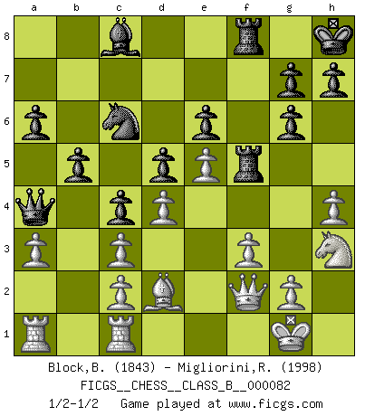 Last move : 1/2-1/2 2010 January 1 15:28:23 [Event "FICGS__CHESS__CLASS_B__000082"] [Site "FICGS"] [Date "2009.08.01"] [Round "1"] [White "Block,Benjamin"] [Black "Migliorini,Roberto"] [Result "1/2-1/2"] [WhiteElo "1843"] [BlackElo "1998"] 1.e4 e6 2.d4 d5 3.Nc3 Bb4 4.e5 c5 5.a3 Bxc3+ 6.bxc3 Ne7 7.Qg4 O-O 8.Bd3 Nbc6 9.Qh5 Ng6 10.Nf3 Qc7 11.Be3 c4 12.Bxg6 fxg6 13.Qg4 Bd7 14.h4 Rf5 15.Ng5 Qa5 16.Bd2 b6 17.O-O Qa4 18.Ra2 Rc8 19.Nh3 Rcf8 20.Rb1 b5 21.Rf1 Bc8 22.Rd1 a6 23.Re1 Bd7 24.Rd1 Kh8 25.f3 Qa5 26.R2a1 Kg8 27.Qg3 Qa4 28.Rdc1 Kh8 29.Qf2 Bc8 1/2-1/2 French : Winawer, Advance, poisoned pawn variation Kingside Castling by player Black (move 7) Kingside Castling by player White (move 17) This chess game ended in a draw. Follow this game move after move (download)Chess problems demand from the composer the same virtues that characterize all worthwhile art: originality, invention, conciseness, harmony, complexity, and splendid insincerity. (Vladimir Nabokov) Ich habe Putins Aufstieg an die Macht beobachtet und seine Politik, die demokratischen Institutionen meines Landes zu zerstören. (Garry Kasparov) En partidas rápidas, el Caballo es mas poderoso que el Alfil. (Vlastimil Hort) Le thème de l'attaque double intervient d'une manière ou d'une autre dans l'immense majorité des combinaisons. (Youri Averbakh) Unless in communicating with it one says exactly what one means, trouble is bound to result. (Alan Turing, about computers)