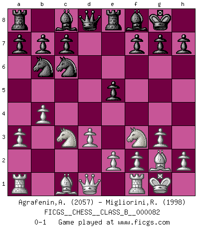 Last move : 0-1 2009 October 27 7:43:53 [Event "FICGS__CHESS__CLASS_B__000082"] [Site "FICGS"] [Date "2009.08.01"] [Round "1"] [White "Agrafenin,Andrey"] [Black "Migliorini,Roberto"] [Result "0-1"] [WhiteElo "2057"] [BlackElo "1998"] 1.c4 Nf6 2.Nc3 e5 3.g3 d5 4.cxd5 Nxd5 5.Bg2 Nb6 6.Nf3 Nc6 7.O-O Be7 8.d3 O-O 9.a3 Re8 10.b4 Bf8 0-1 This chess game has been lost on time (started : 2009.08.01 20:2:25) English Opening Kingside Castling by player White (move 7) Kingside Castling by player Black (move 8) Player Black won this chess game. Follow this game move after move (download)If a ruler does not understand Chess, how can he rule over a kingdom ? (King Khusros II) Ein Remis kann durch Wiederholung von drei Zügen oder durch einen schlechte Zug erreicht werden. (Savielly Grigorievitsch Tartakower) El estómago es una parte esencial del maestro de Ajedrez. (Bent Larsen) D'abord les bases : Jouez et étudiez, puis étudiez et jouez, ensuite jouez et étudiez, puis étudiez et jouez. Deuxièmement : Donnez toujours le meilleur de vous-même ! (Ken Smith) The problem with troubleshooting is that trouble shoots back. (Anonymous)