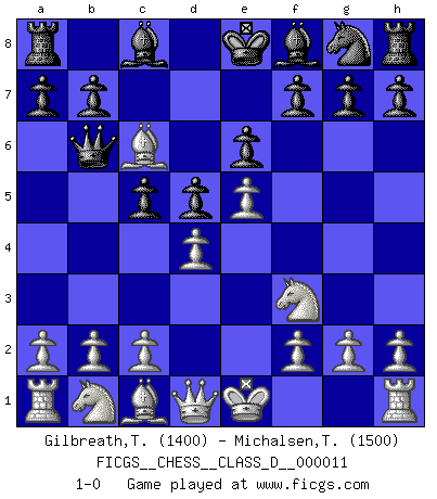 Last move : 1-0 2006 November 6 21:24:21 [Event "FICGS__CHESS__CLASS_D__000011"] [Site "FICGS"] [Date "2006.09.21"] [Round "1"] [White "Gilbreath,Thomas"] [Black "Michalsen,Trond"] [Result "1-0"] [WhiteElo "1400"] [BlackElo "1500"] 1.d4 e6 2.e4 d5 3.e5 c5 4.Bb5+ Nc6 5.Nf3 Qb6 6.Bxc6+ 1-0 This chess game has been lost on time (started : 2006.09.21 10:22:57) Comment by player 1 : Thomas Gilbreath : I am resigning as our match vs. you guys is about to start, and we are both participating. just trying to avoid confusion. - Thomas Queen's pawn Player White won this chess game. Follow this game move after move (download)Fischer is completely natural. He plays no roles. He's like a child. Very, very simple. (Zita Rajcsanyi) Ein Springer auf f6 gegen die eigene Rochadestellung ist schlimmer als ein rostiger Nagel im Knie. (Efim Bogoljubov) El juego de Fischer siempre fue nítido, racional y brillante. Uno de los mejores por siempre. (Dave Regis) Les échecs, c'est l'imagination. (David Bronstein) Treat your password like your toothbrush. Don't let anybody else use it, and get a new one every six months. (Clifford Stoll)