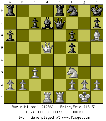 Last move : 1-0 2009 August 5 20:51:56 [Event "FICGS__CHESS__CLASS_C__000120"] [Site "FICGS"] [Date "2009.08.01"] [Round "1"] [White "Ruzin,Mikhail"] [Black "Price,Eric"] [Result "1-0"] [WhiteElo "1786"] [BlackElo "1615"] 1.e4 e5 2.Nf3 Nc6 3.Bb5 a6 4.Ba4 Nf6 5.O-O Nxe4 6.Re1 Nc5 7.Bxc6 dxc6 8.Nxe5 Be7 9.d4 Ne6 10.Be3 O-O 11.Nc3 f6 12.Nf3 f5 13.d5 cxd5 14.Nxd5 Bf6 15.c3 Kh8 16.Qb3 Re8 17.Rad1 Bd7 18.Nxf6 gxf6 19.Qxb7 Qe7 20.Qd5 Nf8 21.Bh6 1-0 Ruy Lopez : Open (Tarrasch) defense Kingside Castling by player White (move 5) Kingside Castling by player Black (move 10) Player White won this chess game. Follow this game move after move (download)White lost because he failed to remember the right continuation and had to think up the moves himself. (Siegbert Tarrasch) Nicht daß Diemer aus Opportunismus Mitglied der NSDAP geworden wäre. Er war ein Fanatiker, in allem, was er tat. (Hans Ree) Los Peones son nacidos libres, y aún así, se encuentran por doquier encadenados. (Rick Kennedy) Aux échecs, l'amour-propre est satisfait quand on remporte la victoire, mais il n'y a pas de honte à être battu. (Benjamin Franklin) Tree pose grows confidence. It roots me to this world. (Terri Guillemets)