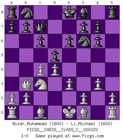 Last move : 1-0 2009 August 24 4:31:20 [Event "FICGS__CHESS__CLASS_C__000120"] [Site "FICGS"] [Date "2009.08.01"] [Round "1"] [White "Nizar,Muhammad"] [Black "Li,Michael"] [Result "1-0"] [WhiteElo "1800"] [BlackElo "1600"] 1.d4 d5 2.c4 c6 3.Nc3 Nf6 4.Nf3 Bf5 5.e3 e6 6.Nh4 Bg6 7.Nxg6 hxg6 8.Qb3 Qc7 9.g3 1-0 QGD Slav defense Player White won this chess game. Follow this game move after move (download)The game of chess is the touchstone of the intellect. (Goethe) Wenn Spassky eine Figur opfert kannst du genauso gut aufgeben. Aber wenn Tal eine Figur opfert, spiel weiter. Er könnte noch eine weitere opfern, und dann ... wer weiß? (Miguel Najdorf) En la perfecta combinación de Ajedrez como en una historia corta de primera clase, toda la trama y contra trama deberá conducir hacia un final sorprendente, el interes no es mitigado hasta el último momento. (Yates and Winter) Tous ces prétendus hommes politiques sont les pions, les Cavaliers, les Tours ou les Fous d'une partie d'échecs qui se jouera tant qu'un hasard ne renversera pas l'échiquier. (Honoré de Balzac) It is not true that people stop pursuing dreams because they grow old, they grow old because they stop pursuing dreams. (Gabriel Garcia Marquez)