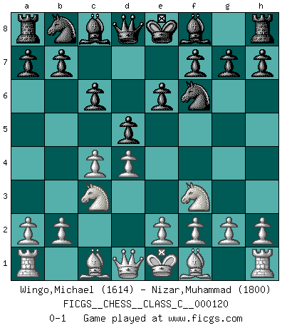 Last move : 0-1 2009 September 13 10:8:27 [Event "FICGS__CHESS__CLASS_C__000120"] [Site "FICGS"] [Date "2009.08.01"] [Round "1"] [White "Wingo,Michael"] [Black "Nizar,Muhammad"] [Result "0-1"] [WhiteElo "1614"] [BlackElo "1800"] 1.d4 d5 2.c4 c6 3.Nf3 Nf6 4.Nc3 e6 0-1 This chess game has been lost on time (started : 2009.08.01 20:9:30) QGD Slav : 4.Nc3 Player Black won this chess game. Follow this game move after move (download)Bobby is the most misunderstood, misquoted celebrity walking the face of this earth. (Yasser Seirawan) Wenn es im Universum noch irgendwo intelligente Lebewesen gibt, dann kennen sie Go. (Emanuel Lasker) El muchacho (en ese entonces un niño de 12 años llamado Anatoly Karpov) no tiene ni idea de lo que es el Ajedrez y no hay futuro en absoluto para el en esta profesión. (Mikhail Botvinnik) On est toujours la mazette de quelqu'un d'autre. (Anonyme) Luck is when opportunity knocks and you answer. (Anonymous)