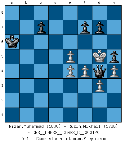 Last move : 0-1 2010 February 27 9:57:52 [Event "FICGS__CHESS__CLASS_C__000120"] [Site "FICGS"] [Date "2009.08.01"] [Round "1"] [White "Nizar,Muhammad"] [Black "Ruzin,Mikhail"] [Result "0-1"] [WhiteElo "1800"] [BlackElo "1786"] 1.d4 d5 2.c4 Nc6 3.cxd5 Qxd5 4.Nf3 e5 5.Nc3 Bb4 6.Bd2 Bxc3 7.Bxc3 e4 8.Ne5 Nxe5 9.dxe5 Be6 10.Qa4+ Bd7 11.Qb4 a5 12.Qa3 e3 13.f3 Ne7 14.Rd1 Qc4 15.g3 Be6 16.Rd3 b5 17.b3 Qc6 18.Bd4 b4 19.Qb2 O-O-O 20.Rxe3 Nf5 21.Rd3 Nxd4 22.Rxd4 Rxd4 23.Qxd4 Rd8 24.Qb2 Qc3+ 25.Qxc3 bxc3 26.e4 Rd2 27.Ba6+ Kd7 28.Be2 Rxa2 29.Kf2 a4 30.bxa4 Bc4 31.Re1 Bxe2 32.Rxe2 c2 33.a5 Kc6 34.Kg2 Kb5 35.a6 Kxa6 36.Kh3 Rb2 37.Kg4 c1Q 38.Rxb2 Qxb2 39.f4 Qg2 40.h4 h5+ 41.Kf5 Qh3+ 42.Kg5 Qg4+ 0-1 QGD : Chigorin defense Queenside Castling by player Black (move 19) Promotion Queen by player Black (move 37) Player Black won this chess game. Follow this game move after move (download)The older I grow, the more I value Pawns. (Keres) Ich spiele 70 Eröffnungssysteme. (Viktor Kortschnoi) No todos los artistas son jugadores de Ajedrez, pero todos los jugadores de Ajedrez son artistas. (Marcel Duchamp) La tactique est l'élément le plus important du milieu de jeu. (Siegbert Tarrasch) Over-the-board chess is the favorite of mortals, correspondence chess is the favorite of the gods. (Eduard Dyckhoff)