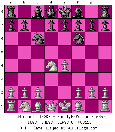 Last move : 0-1 2009 August 27 16:41:46 [Event "FICGS__CHESS__CLASS_C__000120"] [Site "FICGS"] [Date "2009.08.01"] [Round "1"] [White "Li,Michael"] [Black "Rusli,Rafnizar"] [Result "0-1"] [WhiteElo "1600"] [BlackElo "1635"] 1.e4 c5 2.Nf3 Nc6 3.d4 cxd4 4.Nxd4 Nf6 0-1 Sicilian defense Player Black won this chess game. Follow this game move after move (download)The game of Chess is not merely an idle amusement; several very valuable qualities of the mind are to be acquired and strengthened by it, so as to become habits ready on all occasions; for life is a kind of Chess. (Benjamin Franklin) Im Schach gibt es keinen Platz für Galanterie. (Irving Chernev) Una buena ofensiva y una buena defensa, comienzan ambas con un buen desarrollo. (Bruce A. Moon) La solitude du joueur d'Echecs à l'approche du mat est semblable à celle du condamné. (Francis Szpiner) Wawaweewa ! (Borat: Cultural learnings of America for make benefit glorious nation of Kazakhstan)