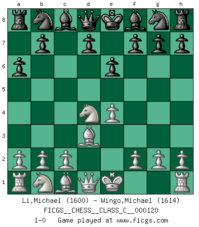 Last move : 1-0 2009 September 11 22:1:5 [Event "FICGS__CHESS__CLASS_C__000120"] [Site "FICGS"] [Date "2009.08.01"] [Round "1"] [White "Li,Michael"] [Black "Wingo,Michael"] [Result "1-0"] [WhiteElo "1600"] [BlackElo "1614"] 1.e4 c5 2.Nf3 e6 3.d4 cxd4 4.Nxd4 a6 5.Bd3 1-0 This chess game has been lost on time (started : 2009.08.01 20:9:30) Sicilian : Kan, 5.Bd3 Player White won this chess game. Follow this game move after move (download)The winner of the game is the player who makes the next-to-last mistake. (Savielly Tartakover) Es gibt keine einzige Frau, der ich nicht einen Springer vorgeben könnte und trotzdem gewänne. (Robert James Fischer) Combinaciones deslumbrantes son para la mayoría, mover madera es para los pocos. (Georg Kieninger) Toutes choses étant égales, c'est la conviction qui gagne. Alliée à une volonté de vaincre, elle sert de détonateur, suscite des idées, disperse les doutes et aide à penser clairement. (Robert Fischer) Nowadays, anyone who cannot speak English and is incapable of using the Internet is regarded as backward. (Al-Waleed bin Talal)