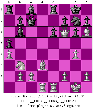 Last move : 1-0 2009 August 18 16:27:26 [Event "FICGS__CHESS__CLASS_C__000120"] [Site "FICGS"] [Date "2009.08.01"] [Round "1"] [White "Ruzin,Mikhail"] [Black "Li,Michael"] [Result "1-0"] [WhiteElo "1786"] [BlackElo "1600"] 1.e4 c6 2.d4 d5 3.Nc3 dxe4 4.Nxe4 Nd7 5.Nf3 Ngf6 6.Ng3 e6 7.Bd3 c5 8.O-O cxd4 9.Nxd4 Bc5 10.Nb3 Bb6 11.Qe2 O-O 12.Bd2 a5 13.a4 Qc7 14.Rfe1 Nd5 15.Nh5 g6 16.Bh6 Re8 17.Rad1 N7f6 18.Nxf6+ Nxf6 19.Qf3 Nh5 20.g4 Ng7 21.Qf6 1-0 Caro-Kann : Steinitz variation Kingside Castling by player White (move 8) Kingside Castling by player Black (move 11) Player White won this chess game. Follow this game move after move (download)I have always a slight feeling of pity for the man who has no knowledge of Chess. (Siegbert Tarrasch) Besser ein falscher Plan, logisch durchgeführt, als gar kein Plan. (Viktor Kortschnoi) Botvinnik trató de alejar el misterio referente al Ajedrez, siempre relacionandolo a situaciones de la vida diaria. Solía llamar al Ajedrez un problema inexacto típico, similar a aquellos en que la gente tiene siempre que resolver a cada día. (Garry Kasparov) Il n'y a plus de joueurs du niveau de Jacob Murray dont la seule quête est le beau jeu, le plaisir de voir les pièces construire quelque chose. Sur 10 idées à la minute, 9 seront sans intérêt, la dernière s'avèrera géniale. (Christian Bauer) If you don't practice you don't deserve to win. (Andre Agassi)