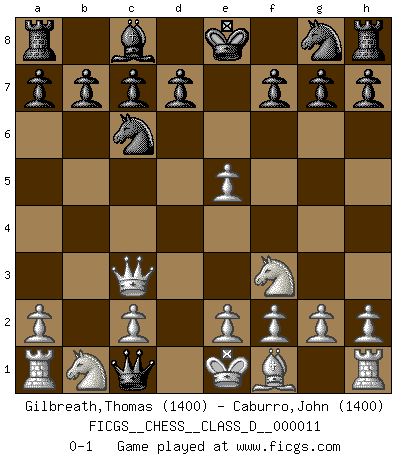 Last move : 0-1 2006 October 2 19:51:30 [Event "FICGS__CHESS__CLASS_D__000011"] [Site "FICGS"] [Date "2006.09.21"] [Round "1"] [White "Gilbreath,Thomas"] [Black "Caburro,John"] [Result "0-1"] [WhiteElo "1400"] [BlackElo "1400"] 1.d4 e5 2.dxe5 Nc6 3.Nf3 Qe7 4.Bf4 Qb4+ 5.Bd2 Qxb2 6.Bc3 Bb4 7.Qd2 Bxc3 8.Qxc3 Qc1+ 0-1 Queen's pawn : Charlick (Englund) gambit Player Black won this chess game. Follow this game move after move (download)The tactician must know what to do whenever something needs doing; the strategist must know what to do when nothing needs doing. (Savielly Tartakover) Sie führen leise Selbstgespräche, schlürfen lautstark ihre Getränke, schmatzen hörbar beim Essen, blasen ihrem Gegenüber Rauch in die Augen, niesen ihm ins Gesicht, starren ihn unverwandt an, bis er sich unter ihren Blicken windet, rutschen ständig auf ihrem Stuhl hin und her, rülpsen und bohren in der Nase. (Anonymous) La belleza de un movimiento no se refleja solo en su apariencia, sino en el pensamiento detrás de él. (Siegbert Tarrasch) Les Echecs ne sont pas pour les âmes timides. Ils requièrent un homme entier, qui ne s'arrête pas aveuglément à ce qui a été déjà établi, mais qui tente individuellement de sonder les profondeurs du jeu. (W. Steinitz) Horse racing is animated roulette. (Roger Kahn)