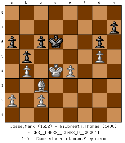 Last move : 1-0 2006 November 20 3:55:57 [Event "FICGS__CHESS__CLASS_D__000011"] [Site "FICGS"] [Date "2006.09.21"] [Round "1"] [White "Josse,Mark"] [Black "Gilbreath,Thomas"] [Result "1-0"] [WhiteElo "1622"] [BlackElo "1400"] 1.e4 d5 2.exd5 Qxd5 3.Nc3 Qa5 4.Bc4 c6 5.d3 Nf6 6.Bd2 Qc7 7.Qe2 Bf5 8.h3 e6 9.g4 Bg6 10.f4 Be7 11.Nf3 Nbd7 12.O-O-O O-O-O 13.f5 exf5 14.Qxe7 fxg4 15.hxg4 Rhe8 16.Qa3 a6 17.Rhg1 Ne5 18.Nxe5 Qxe5 19.g5 Nd7 20.Rge1 Qc5 21.Qxc5 Nxc5 22.Rxe8 Rxe8 23.Rf1 Ne6 24.Ne4 Kd7 25.Bc3 Bxe4 26.Rxf7+ Re7 27.Bxe6+ Kxe6 28.Rxe7+ Kxe7 29.dxe4 g6 30.Kd2 Ke6 31.b4 b5 32.Ke3 Kd6 33.Kd4 1-0 Scandinavian (centre counter) defense Queenside Castling by player White (move 12) Queenside Castling by player Black (move 12) Player White won this chess game. Follow this game move after move (download)White lost because he failed to remember the right continuation and had to think up the moves himself. (Siegbert Tarrasch) Sitze auf Deine Hände. (Siegbert Tarrasch) Un Peón pasado aumenta su poder a medida de que el número de piezas en el tablero disminuye. (Capablanca) Comme les marins qui ont mille raisons différentes d'aller en mer, les joueurs d'échecs en ont tout autant avant de s'installer devant une table et jouer... (Vincent Bertignac, philosophe) You know what they say : You lie down with the Devil, you wake up in Hell. (Horatio Caine, C.S.I. Miami)