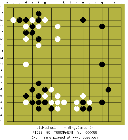 Last move : 1-0 2009 October 7 9:9:8 [Event "FICGS__GO__TOURNAMENT_KYU__000088"] [Site "FICGS"] [Date "2009.08.02"] [Round "1"] [Black "Li,Michael"] [White "Wing,James"] [Result "1-0"] 1.q16 d16 2.q4 d4 3.q10 d10 4.f3 h4 5.f5 f4 6.e4 f6 7.g4 g5 8.h3 e5 9.f4 j3 10.h5 k4 11.g6 h6 12.e6 j4 13.d5 j5 14.n3 m3 15.n4 m4 16.r6 g5 17.f7 n5 18.f17 j16 19.f14 j14 20.c17 f16 21.e16 e17 22.e15 b17 23.d17 g17 24.f18 f13 25.n17 d14 26.d15 o4 27.o3 1-0 This go game has been lost on time (started : 2009.08.02 3:29:22) Here are the names of the openings (joseki) played in the four corners : Corner d4 : d4 f3 Hoshi (Hwajeom, Seongjeom, Xingwei`) 4-4 Point. The star or hoshi (4-4) point, emphasizing influence at the potential expense of territory. Ikken Kakari (Hankan Keolch'im, Yi Gua`jiao~, 1-Space Low Approach). Black 2 is the standard approach move to the 4-4. Corner d16 : d16 f17 Hoshi (Hwajeom, Seongjeom, Xingwei`) 4-4 Point. The star or hoshi (4-4) point, emphasizing influence at the potential expense of territory. Ikken Kakari (Hankan Keolch'im, Yi Gua`jiao~, 1-Space Low Approach). Black 2 is the standard approach move to the 4-4. Player Black won this Go (weiqi, baduk) game. Follow this game move after move (download)Those who are good at winning, don't usually fight. (Zhang) A woman without a man is like a fish without a bicycle. (Gloria Steinem)