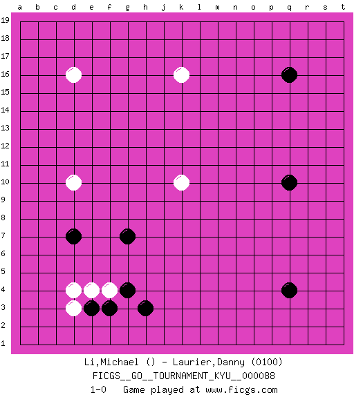 Last move : 1-0 2009 September 12 22:3:29 [Event "FICGS__GO__TOURNAMENT_KYU__000088"] [Site "FICGS"] [Date "2009.08.02"] [Round "1"] [Black "Li,Michael"] [White "Laurier,Danny"] [Result "1-0"] [Rating 2 "0100"] 1.q16 d16 2.q4 d4 3.q10 d10 4.f3 f4 5.g4 e4 6.e3 d3 7.h3 k16 8.g7 k10 9.d7 1-0 This go game has been lost on time (started : 2009.08.02 3:29:22) Here are the names of the openings (joseki) played in the four corners : Corner d4 : d4 f3 Hoshi (Hwajeom, Seongjeom, Xingwei`) 4-4 Point. The star or hoshi (4-4) point, emphasizing influence at the potential expense of territory. Ikken Kakari (Hankan Keolch'im, Yi Gua`jiao~, 1-Space Low Approach). Black 2 is the standard approach move to the 4-4. Player Black won this Go (weiqi, baduk) game. Follow this game move after move (download)More haste less speed. (John Fairbairn) The Internet isn't free. It just has an economy that makes no sense to capitalism. (Brad Shapcott)