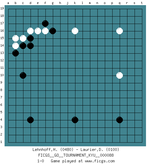 Last move : 1-0 2009 September 15 10:13:27 [Event "FICGS__GO__TOURNAMENT_KYU__000088"] [Site "FICGS"] [Date "2009.08.02"] [Round "1"] [Black "Lehnhoff,Heinz-Georg"] [White "Laurier,Danny"] [Result "1-0"] [Rating 1 "0480"] [Rating 2 "0100"] 1.d4 q16 2.q4 d16 3.c10 q10 4.k4 k16 5.c14 c15 6.d14 b14 7.b13 b15 8.d15 e16 9.g16 f16 10.f17 1-0 This go game has been lost on time (started : 2009.08.02 3:29:22) Here are the names of the openings (joseki) played in the four corners : Corner d16 : d16 c14 Hoshi (Hwajeom, Seongjeom, Xingwei`) 4-4 Point. The star or hoshi (4-4) point, emphasizing influence at the potential expense of territory. Ikken Kakari (Hankan Keolch'im, Yi Gua`jiao~, 1-Space Low Approach). Black 2 is the standard approach move to the 4-4. Corner d4 : d4 1-0 Hoshi (Hwajeom, Seongjeom, Xingwei`) 4-4 Point. The star or hoshi (4-4) point, emphasizing influence at the potential expense of territory. Player Black won this Go (weiqi, baduk) game. Follow this game move after move (download)Avoid the plate connection. (Anonymous) Excelling at chess has long been considered a symbol of more general intelligence. That is an incorrect assumption in my view, as pleasant as it might be. But for the purposes of argument and investigation, chess is, in Russkin-Gutman's words, 'an unparalleled laboratory, since both the learning process and the degree of ability obtained can be objectified and quantified, providing an excellent comparative framework on which to use rigorous analytical techniques.' (The Chess Master and the Computer, by Garry Kasparov - 2010)