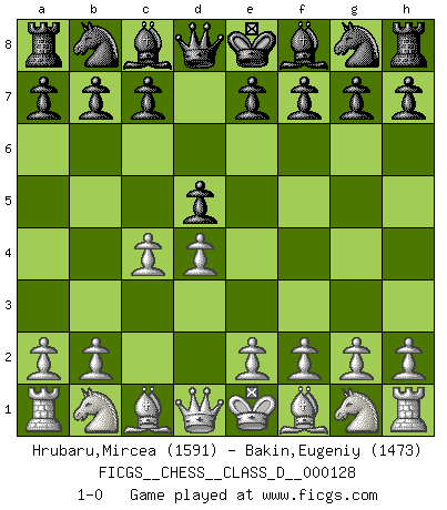 Last move : 1-0 2009 September 17 10:20:6 [Event "FICGS__CHESS__CLASS_D__000128"] [Site "FICGS"] [Date "2009.08.07"] [Round "1"] [White "Hrubaru,Mircea"] [Black "Bakin,Eugeniy"] [Result "1-0"] [WhiteElo "1591"] [BlackElo "1473"] 1.d4 d5 2.c4 1-0 This chess game has been lost on time (started : 2009.08.07 22:52:17) Queen's Gambit Player White won this chess game. Follow this game move after move (download)It is not a move, even the best move that you must seek, but a realizable plan. (Eugene Znosko-Borovsky) Im Schach gibt es keinen Platz für Galanterie. (Irving Chernev) Botvinnik trataba de restarle el misterio al Ajedrez, siempre relacionandolo a situaciones de la vida ordinaria. El gustaba de llamar al Ajedrez un típico problema inexacto similar a aquellos de los cuales la gente siempre tiene que enfrentarse en la vida cotidiana. (Garry Kasparov) La menace est plus forte que l'exécution. (Aaron Nimzovitch) When you stop learning you start dying. (M. Scott Adams)
