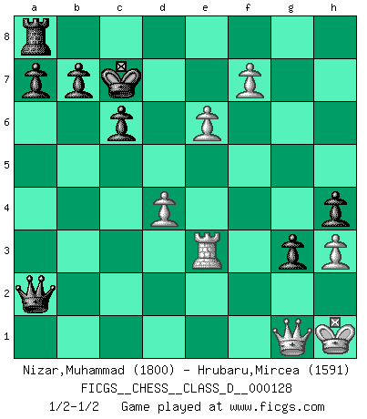 Last move : 1/2-1/2 2010 March 15 5:17:44 [Event "FICGS__CHESS__CLASS_D__000128"] [Site "FICGS"] [Date "2009.08.07"] [Round "1"] [White "Nizar,Muhammad"] [Black "Hrubaru,Mircea"] [Result "1/2-1/2"] [WhiteElo "1800"] [BlackElo "1591"] 1.d4 d5 2.c4 c6 3.Nc3 Nf6 4.Nf3 e6 5.e3 Ne4 6.Bd3 f5 7.Ne5 Qh4 8.O-O Nd7 9.cxd5 exd5 10.g3 Qh3 11.Ne2 g5 12.Nc3 Nxe5 13.dxe5 h5 14.Qe2 h4 15.g4 Nxc3 16.bxc3 fxg4 17.f4 gxf4 18.Bg6+ Kd8 19.exf4 Bc5+ 20.Kh1 g3 21.f5 Rg8 22.Qg2 Qg4 23.h3 Qc4 24.Bd2 Kc7 25.Rae1 Be6 26.Bh7 Rg7 27.fxe6 Rxh7 28.Rf7+ Rxf7 29.exf7 Qd3 30.e6 Qf5 31.Be3 Bxe3 32.Rxe3 d4 33.cxd4 Qb1+ 34.Qg1 Qxa2 35.Qg2 Qb1+ 36.Qg1 Qa2 1/2-1/2 QGD Slav defense Kingside Castling by player White (move 8) This chess game ended in a draw. Follow this game move after move (download)A win by an unsound combination, however showy, fills me with artistic horror. (Wilhelm Steinitz) Sehr viele beherrschen heutzutage das große Einmalseins des Schachspiels und kennen sogar dessen Logarithmentafeln auswendig - deshalb sollte man hin und wieder zu beweisen trachten, dass zwei mal zwei auch fünf sein kann. (Mikhail Nekhemyevich Tal) Un mal día en el Ajedrez, es mejor que cualquier buen día en el trabajo. (Anonymous) A ce moment-là, je menaçais de comprendre la position ! (Clément L'Heureux) Knowledge will give you power, but character respect. (Bruce Lee)