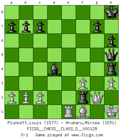 Last move : 0-1 2009 December 2 13:8:2 [Event "FICGS__CHESS__CLASS_D__000128"] [Site "FICGS"] [Date "2009.08.07"] [Round "1"] [White "Plunkett,Louis"] [Black "Hrubaru,Mircea"] [Result "0-1"] [WhiteElo "1577"] [BlackElo "1591"] 1.f4 e5 2.fxe5 d6 3.exd6 Bxd6 4.Nf3 Nc6 5.d4 Nf6 6.Bg5 Bg4 7.e3 h6 8.Bxf6 Qxf6 9.Bb5 O-O 10.O-O Qe7 11.h3 Qxe3+ 12.Kh1 Bxf3 13.Rxf3 Qxd4 14.Nc3 Qe5 15.Qg1 Nd4 16.Re3 Qg5 17.Bd3 f5 18.Bc4+ Kh8 19.Bd3 f4 20.Ne4 Qh4 21.Qe1 Qe7 22.Re2 Nxe2 23.Qxe2 Rad8 24.Qh5 Qe5 25.Qg6 Qe8 26.Qg4 f3 27.gxf3 Be5 28.Rg1 Rf4 29.Qg2 Qh5 30.Be2 Rh4 31.Nf2 Rd2 32.Re1 Bd4 33.Bf1 Rxf2 0-1 Bird : From gambit Kingside Castling by player Black (move 9) Kingside Castling by player White (move 10) Player Black won this chess game. Follow this game move after move (download)You know, comrade Pachman, I don't enjoy being a Minister, I would rather play Chess like you. (Che Guevara) Ich bin es gewohnt, das die Jugend mir überhaupt keinen Respekt entgegenbringt. (Alexander Morozewich) El Ajedrez te enseña a controlarl la excitación inicial que sientes cuando vez algo que parece bueno y te enseña a pensar objetivamente cuando te encuentras en problemas. (Stanley Kubrick) Vous m'avez demandé de vous exposer quel est le fondement de la prière. Je ne fais que préparer les pièces du jeu sur la table... Nous sera-t-il permis d'en adopter les règles et si nous les appliquons scrupuleusement nous ne tarderons pas à faire mat le Roi divin ! Il ne pourra échapper à nos mains. (Sainte Thérèse d'Avila, Chemin de perfection) . 'gn is not allowed in chess unless n is an integer between 1 and 8 inclusive, where 1 and 8 are to interpreted as the standard numerals standing for integers in the ordered real-closed field R, with the *canonical* ordering. (As opposed to, say, an integer in the domain Z[2+i*sqrt(5)] or an integer in some exotic Grothendieck topos). (Normajean Yates)