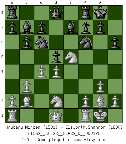 Last move : 1-0 2009 October 13 21:3:30 [Event "FICGS__CHESS__CLASS_D__000128"] [Site "FICGS"] [Date "2009.08.07"] [Round "1"] [White "Hrubaru,Mircea"] [Black "Elsworth,Shannon"] [Result "1-0"] [WhiteElo "1591"] [BlackElo "1800"] 1.d4 Nf6 2.c4 e6 3.Nf3 b6 4.g3 Ba6 5.Nbd2 Bb7 6.Bg2 Be7 7.O-O O-O 8.b3 Nc6 9.e4 h6 10.Bb2 d5 11.exd5 exd5 12.Ne5 1-0 Queen's Indian : Nimzovich variation (exaggerated Fianchetto) Kingside Castling by player White (move 7) Kingside Castling by player Black (move 7) Player White won this chess game. Follow this game move after move (download)Chess is mental torture. (Garry Kasparov) Ich verstehe Aljechins Kombinationen ganz gut; aber woher er diese Angriffschancen bekommt und wie er die Eröffnung behandelt das ist für mich ein Buch mit sieben Siegeln. (Rudolf Spielmann) Observen a Garry Kasparov. Después de una derrota, invariablemente el gana la próxima partida. Prácticamente hace pedazos a su siguiente oponente. Eso es algo que tenemos que aprender a lograr. (Maurice Ashley) Il n'y a pas eu de défaite parce que je ne crois pas que cet ordinateur ait jamais existé. IBM a triché en refusant d'imprimer les modes de recherche de la machine. C'est évident, pendant le match, des coups décisifs ont été joués par des êtres humains. Aujourd'hui, les meilleurs spécialistes en informatique ne peuvent toujours pas expliquer comment Deep-Blue a pu jouer contre la logique des ordinateurs. IBM a gagné une guerre de communication, mais ils sont incapables de prouver que l'ordinateur a gagné tout seul. (Garry Kasparov) If you are good, you will be assigned all the work. If you are really good, you will get out of it. (Dan Rotaru)