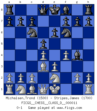 Last move : 0-1 2006 November 8 21:47:57 [Event "FICGS__CHESS__CLASS_D__000011"] [Site "FICGS"] [Date "2006.09.21"] [Round "1"] [White "Michalsen,Trond"] [Black "Stripes,James"] [Result "0-1"] [WhiteElo "1500"] [BlackElo "1700"] 1.d4 d5 2.e3 Nf6 3.Bd3 Bg4 4.Ne2 Nc6 5.f4 e6 0-1 This chess game has been lost on time (started : 2006.09.21 10:22:57) Queen's pawn : Stonewall attack Player Black won this chess game. Follow this game move after move (download)Play the opening like a book, the middle game like a magician, and the endgame like a machine. (Spielmann) Die Partien sind immer verschieden, die Interviews immer die gleichen. (Garry Kasparov) El Ajedrez es un expediente tonto que hace creer a la gente inactiva que hacen una cosa muy astuta cuando solamente estan perdiendo su tiempo. (George Bernard Shaw) Shah mat. Le roi est mort. Cri de fierté d'un joueur venant de terrasser son adversaire, courtoisement, sans effusion de sang. There will be no order, only chaos. (Sol Robeson in Pi by Darren Aronofsky)