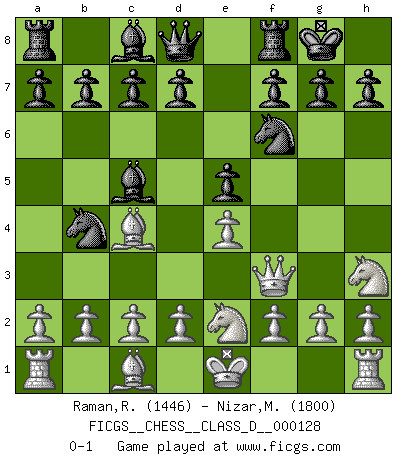 Last move : 0-1 2009 October 14 21:6:16 [Event "FICGS__CHESS__CLASS_D__000128"] [Site "FICGS"] [Date "2009.08.07"] [Round "1"] [White "Raman,Ranganathan"] [Black "Nizar,Muhammad"] [Result "0-1"] [WhiteElo "1446"] [BlackElo "1800"] 1.Nh3 e5 2.e4 Nf6 3.Nc3 Bc5 4.Bc4 O-O 5.Qf3 Nc6 6.Ne2 Nb4 0-1 This chess game has been lost on time (started : 2009.08.07 22:52:17) Amar (Paris) Opening Kingside Castling by player Black (move 4) Player Black won this chess game. Follow this game move after move (download)Half the variations which are calculated in a tournament game turn out to be completely superfluous. Unfortunately, no one knows in advance which half. (Jan Tinman) Der 70jährige Viktor Kortschnoi: Die Rentenanstalt wollte mich zwingen in Rente zu gehen. Meine Frau erhält jetzt eine Pension- und ich zahle weiter in die Rentenkasse ein! (Viktor Kortschnoi) En el Ajedrez, tal como es jugado por los Maestros, practicamente la suerte es eliminada. (Emanuel Lasker) Pour moi, les échecs ne sont pas un jeu mais un art. (Alexandre Alekhine) Yoga is 99% practice and 1% knowledge. (Sri Krishna Pattabhi Jois)
