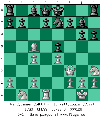 Last move : 0-1 2009 October 25 7:28:51 [Event "FICGS__CHESS__CLASS_D__000128"] [Site "FICGS"] [Date "2009.08.07"] [Round "1"] [White "Wing,James"] [Black "Plunkett,Louis"] [Result "0-1"] [WhiteElo "1400"] [BlackElo "1577"] 1.e4 c5 2.Bc4 Nc6 3.Qh5 e6 4.d3 g6 5.Qf3 Bg7 6.Nh3 h6 7.Be3 Bxb2 8.Bxc5 Bxa1 9.O-O Bg7 10.Rd1 Ne5 11.Qf4 Nxc4 12.dxc4 e5 13.Qf3 Ne7 0-1 Sicilian defense Kingside Castling by player White (move 9) Player Black won this chess game. Follow this game move after move (download)Even the laziest King flees wildly in the face of a double check ! (Aaron Nimzowitsch) Man gibt nur Pakete auf. (Paul Keres) Nunca nadie ha ganado una partida de Ajedrez rindiendose. (Unknown) Les sacrifices démontrent seulement que quelqu'un a gaffé. (Savielly Tartacover) Fame, I have already. Now I need the money. (an elderly Steinitz)