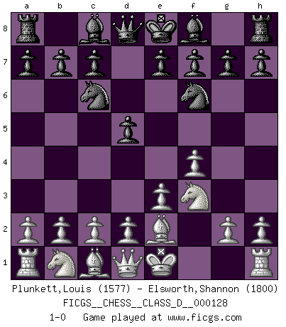 Last move : 1-0 2009 September 21 10:46:4 [Event "FICGS__CHESS__CLASS_D__000128"] [Site "FICGS"] [Date "2009.08.07"] [Round "1"] [White "Plunkett,Louis"] [Black "Elsworth,Shannon"] [Result "1-0"] [WhiteElo "1577"] [BlackElo "1800"] 1.f4 Nf6 2.Nf3 d5 3.e3 Nc6 4.Be2 1-0 This chess game has been lost on time (started : 2009.08.07 22:52:17) Bird's Opening Player White won this chess game. Follow this game move after move (download)Could we look into the head of a Chess player, we should see there a whole world of feelings, images, ideas, emotion and passion. (Alfred Binet) Der zweitbeste Zug ist oft der einzig richtige. (Savielly Grigorievitsch Tartakower) El Ajedrez te enseña a controlarl la excitación inicial que sientes cuando vez algo que parece bueno y te enseña a pensar objetivamente cuando te encuentras en problemas. (Stanley Kubrick) Karpov est une pièce de musée. (Garry Kasparov) Now be brave and don't look back. Don't look back. (Shmi Skywalker in Star Wars ep.1)