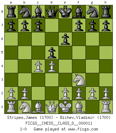 Last move : 1-0 2006 October 31 20:8:56 [Event "FICGS__CHESS__CLASS_D__000011"] [Site "FICGS"] [Date "2006.09.21"] [Round "1"] [White "Stripes,James"] [Black "Bichev,Vladimir"] [Result "1-0"] [WhiteElo "1700"] [BlackElo "1700"] 1.Nf3 e6 2.d4 d5 3.c4 1-0 This chess game has been lost on time (started : 2006.09.21 10:22:57) Reti Opening Player White won this chess game. Follow this game move after move (download)I'd rather have a Pawn than a finger. (Reuben Fine) Ich erzeugte keinen Neid, da mich die Schachspieler als Musiker und die Musiker als Schachspieler betrachteten. (Mark Taimanov) Yo siempre he tenido un ligero sentimiento de lástima por una persona que no tiene conocimiento del Ajedrez. (Siegbert Tarrasch) La vie est comme un jeu d'échecs : nous esquissons un plan, mais celui-ci est tributaire de ce que daignent faire l'adversaire aux échecs et le destin dans la vie. (Arthur Schopenhauer) If you don't practice you don't deserve to win. (Andre Agassi)