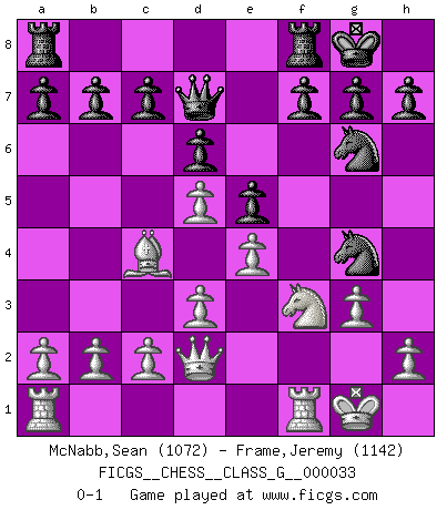 Last move : 0-1 2009 October 25 19:29:40 [Event "FICGS__CHESS__CLASS_G__000033"] [Site "FICGS"] [Date "2009.08.08"] [Round "1"] [White "McNabb,Sean"] [Black "Frame,Jeremy"] [Result "0-1"] [WhiteElo "1072"] [BlackElo "1142"] 1.e4 e5 2.Nf3 Nf6 3.Nc3 Nc6 4.Bc4 Bc5 5.O-O O-O 6.d3 d6 7.Be3 Bxe3 8.fxe3 Be6 9.Nd5 Bxd5 10.exd5 Ne7 11.e4 Ng6 12.g3 Ng4 13.Qd2 Qd7 0-1 Petrov Three knights game Kingside Castling by player White (move 5) Kingside Castling by player Black (move 5) Player Black won this chess game. Follow this game move after move (download)A chess genius has died; a loss for humanity. (Viktor Kortchnoi, about Bobby Fischer's death) Ich war zu klein für die Schach-Schülermannschaft! (Woody Allen) No hay un Gran Maestro de Ajedrez que sea normal; solo se diferencían ellos por la magnitud de su locura. (Viktor Korchnoi) La guerre est enfant de la passion, la passion est enfant du narcissisme et le narcissisme est l'enfant. (...) Une autre partie ? (Thibault de Vassal) The large trees attract high winds. (Chinese proverb)
