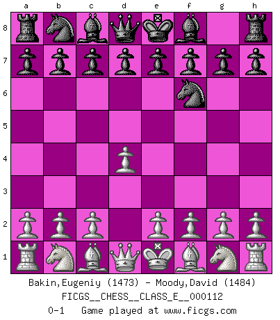 Last move : 0-1 2009 September 20 22:44:26 [Event "FICGS__CHESS__CLASS_E__000112"] [Site "FICGS"] [Date "2009.08.11"] [Round "1"] [White "Bakin,Eugeniy"] [Black "Moody,David"] [Result "0-1"] [WhiteElo "1473"] [BlackElo "1484"] 1.d4 Nf6 0-1 This chess game has been lost on time (started : 2009.08.11 16:57:15) Queen's pawn game Player Black won this chess game. Follow this game move after move (download)There just isn't enough televised Chess. (David Letterman) Im Wettkampf zwischen starken Meistern kommen Fehler sehr selten vor, deshalb ist es mit bloßem Warten nicht getan. (José Raúl Capablanca) Tu sabes, camarada Pachman, no disfruto el ser un Ministro, preferería jugar al Ajedrez como tu. (Che Guevara) Des points faibles ou des trous dans la position de l'adversaire doivent être occupés par des pièces et non pas par des pions. (Siegbert Tarrasch) Life is like a play: it's not the length but the excellence of the acting that matters. (Seneca)