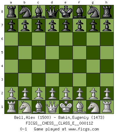 Last move : 0-1 2009 September 20 22:44:26 [Event "FICGS__CHESS__CLASS_E__000112"] [Site "FICGS"] [Date "2009.08.11"] [Round "1"] [White "Bell,Alex"] [Black "Bakin,Eugeniy"] [Result "0-1"] [WhiteElo "1500"] [BlackElo "1473"] 0-1 This chess game has been lost on time (started : 2009.08.11 16:57:15) Player Black won this chess game. Follow this game move after move (download)Best by test: 1. e4 (Bobby Fischer) Fischer machte Schach einfach zu einer aufregenden Sache, wann immer er sich ans Brett setzte. (Raymond Keene) Vive, pierde y aprende al observar a tu oponente como gana. (Amber Steenbock) Les ravages du H expliquent la différence de niveau entre Tal et Thal [Abergel]. The man who strikes first admits that his ideas have given out. (Chinese proverb)
