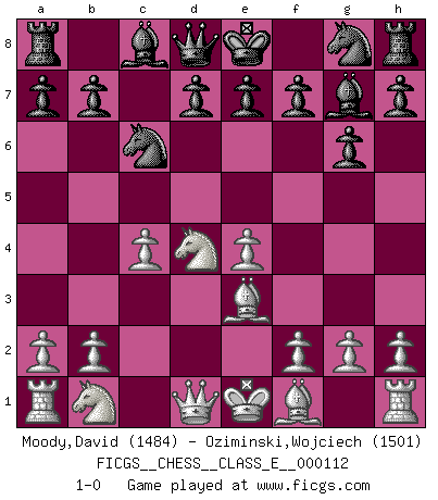 Last move : 1-0 2009 September 21 10:11:12 [Event "FICGS__CHESS__CLASS_E__000112"] [Site "FICGS"] [Date "2009.08.11"] [Round "1"] [White "Moody,David"] [Black "Oziminski,Wojciech"] [Result "1-0"] [WhiteElo "1484"] [BlackElo "1501"] 1.Nf3 c5 2.c4 g6 3.e4 Nc6 4.d4 cxd4 5.Nxd4 Bg7 6.Be3 1-0 This chess game has been lost on time (started : 2009.08.11 16:57:15) Reti Opening Player White won this chess game. Follow this game move after move (download)I guess a certain amount of temperament is expected of Chess geniuses. (Ron Gross) Der Bart als Geschlechtszeichen mitten im Gesicht ist obszön. Daher gefällt er den Weibern. [Zugegeben, kein Schachzitat, aber unglaublich originell] (Arthur Schopenhauer) Me dio la sensación de como si yo estuviera jugando en contra del mismo Ajedrez. - al estar jugando en contra de Robert Fischer (Walter Shipman) Avec des compensations pour le matériel en plus... (Anonyme) To be champion requires more than simply being a strong player; one has to be a strong human being as well. (Anatoly Karpov)